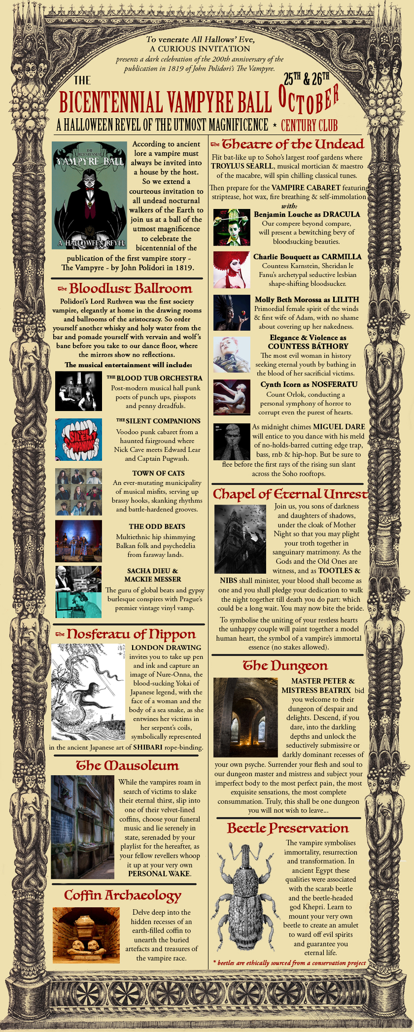 The Cast for the Bicentennial Vampyre Ball is listed below. Please use the links below to find out more about each of the performers. New acts will be anounced each week in the run up to the ball. |