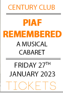 PIAF REMEMBERED A Musical Cabaret with Oriana Curls At the Century Club - Soho W1 Friday & Saturday the 27th & 28th January 2023 Doors open at 7:00 pm, Show commences at 7:30 pm Piaf Remembered is an intimate musical cabaret featuring many of Edith Piaf’s timeless classics, sung in French by renowned jazz and cabaret singer Oriana Curls. The show evokes Piaf as a performer through the memories of a man who as a boy witnessed what was to be her last performance at the Olympia Paris Music Hall in 1962 – a place where she had many triumphs. We see and hear Piaf perform through his eyes and ears. Featuring the stunning vocals of the renowned French born jazz and cabaret singer Oriana Curls, with multi-instrumentalist Katy Jungmann on saxophone, accordion and clarinet, Chris Jerome on piano, and Gary Merry who both wrote the script and directed the production, acting as the narrator. Tickets £12 - please click here to buy. |